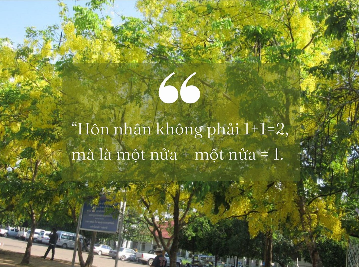Gần đây tôi xem một bộ phim rất hay, trong đó có chi tiết, người bố nói với con gái và chàng rể, trong lễ cưới: “Hôn nhân không phải 1+1=2, mà là một nửa + một nửa = 1. Nghĩa là, sau khi lấy nhau, các con đều phải mài giũa bớt một nửa cái tôi thì mới có thể hợp thành một gia đình hạnh phúc”.