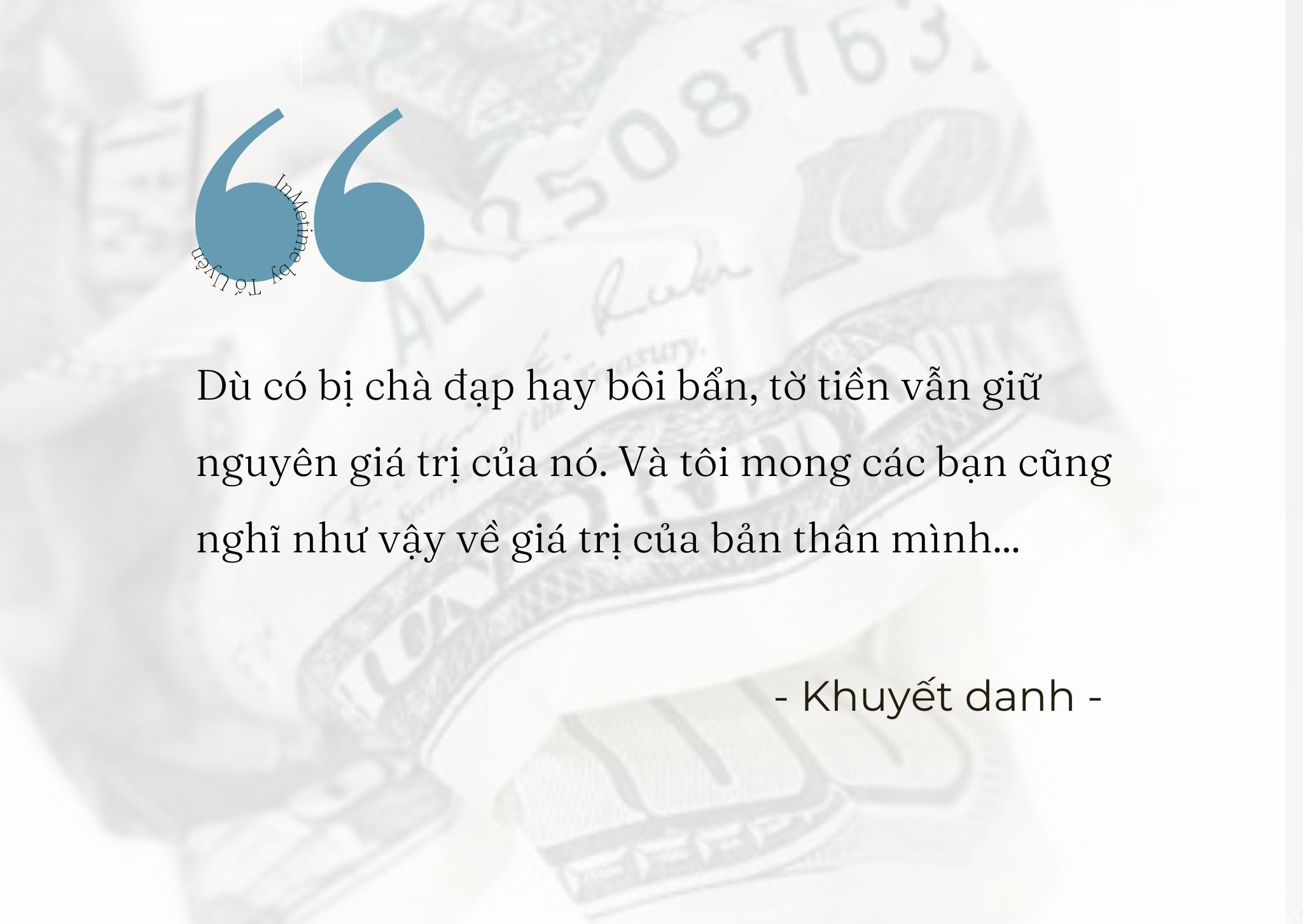 Ông nói: “Các bạn thấy đấy, dù tôi có vò nát hay làm bẩn, đây vẫn là tờ tiền 100 đô-la. Dù có bị chà đạp hay bôi bẩn, tờ tiền vẫn giữ nguyên giá trị của nó. Và tôi mong các bạn cũng nghĩ như vậy về giá trị của bản thân mình”. Tôi cắt bài báo ấy ra dán lên trước bàn học, mỗi ngày đều ngẩng lên đọc nhiều lần. Tôi tự động viên mình, dù gia đình, bạn bè, làng xóm không tin tôi, giá trị của tôi vẫn không có gì thay đổi. Tôi biết mình không ăn cắp, và thế là đủ rồi.